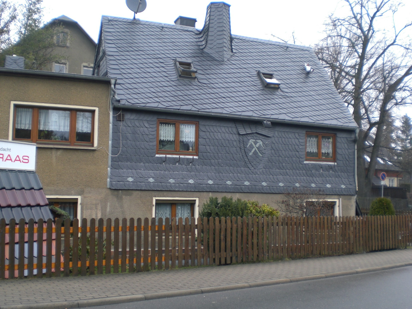 Das stilvoll mit Schiefer verkleidete Wohnhaus ist eines der ältesten in Grüna. Meisterhaft wurde der 6-eckige Schornstein sowie das Dachdeckeremblem in Schiefer eingedeckt. Dieser Anblick lädt manchen Spaziergänger zum Staunen ein.